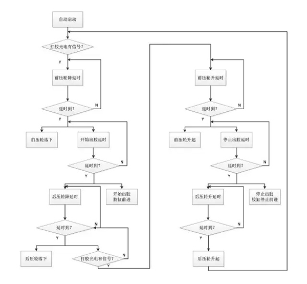 3.傳送打膠:當(dāng)達(dá)到設(shè)定溫度后,手持鋁框放在傳送帶上,當(dāng)前端打膠光電檢測到鋁框時(shí),自動(dòng)涂膠過程開始。打膠光電有信號(hào)后,延時(shí)一段時(shí)間,前壓輪下壓,壓住鋁框;前壓輪下壓后延時(shí)一段時(shí)間,膠缸前進(jìn),膠嘴出膠。開始涂膠后,再延時(shí)一段時(shí)間,后壓輪下壓。打膠光電信號(hào)消失后,延時(shí)一段時(shí)間,前壓輪抬起,前壓輪抬起后,再延時(shí)一段時(shí)間,膠缸停止前進(jìn),同時(shí)膠嘴停止涂膠;停止涂膠后,再延時(shí)一段時(shí)間后,后壓輪抬起,鋁框一邊涂膠完成。